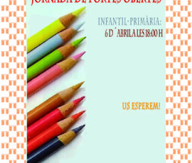 El jueves 6 de abril a las 18.00 te esperamos en el edificio de infantil y primaria para visitar nuestras instalaciones. Si tienes dudas sobre la matrícula o sobre la forma de trabajar te invitamos a visitarnos. Durante la jornada tendrás la oportunidad de disfrutar de talleres que mostrarán los proyectos más novedosos de nuestro centro: amco, entusiasmat, el huerto escolar…