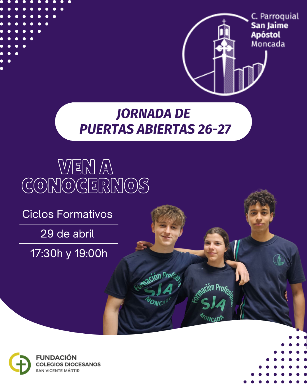 El Colegio Parroquial San Jaime Apóstol de Moncada, celebra todos los años unas Jornada de Puertas Abiertas con el fin de que las familias podáis conocer, de primera mano, nuestro Proyecto Educativo, las instalaciones y preguntar lo que necesitéis conocer de nuestro Colegio.