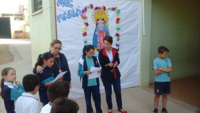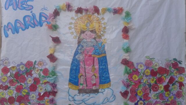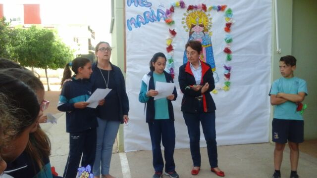 Durante este més de mayo los alumnos de infantil y primaria estamos haciendo nuestra particular ofrenda a la Virgen, cada semana, un curso es el encargado de ofrecerle las flores que hemos hecho en clase y realizar una pequeña oración ante la Virgen.